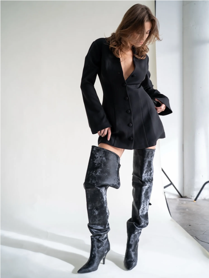 - Beispiel A: Schwarze Schuhe mit mittelhohem Absatz + graue Anzughose + beiger Strickpullover