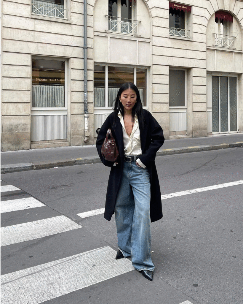 - Variante C: Ausgestellte Jeans + langer Mantel + Sneaker/Ankle Boots